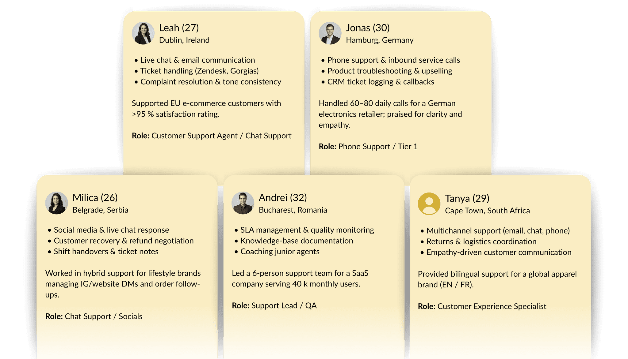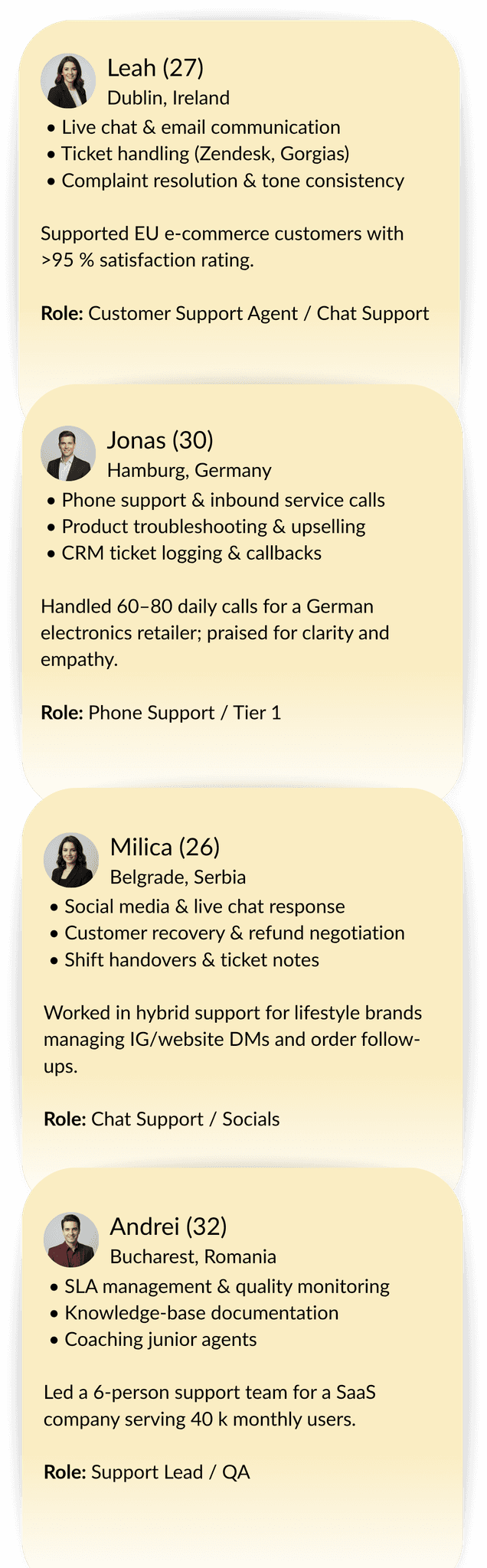 We place high-quality support professionals who make your brand look good—on phone, chat, and email. Clear English (and other languages on request), strong empathy, and crisp problem-solving.