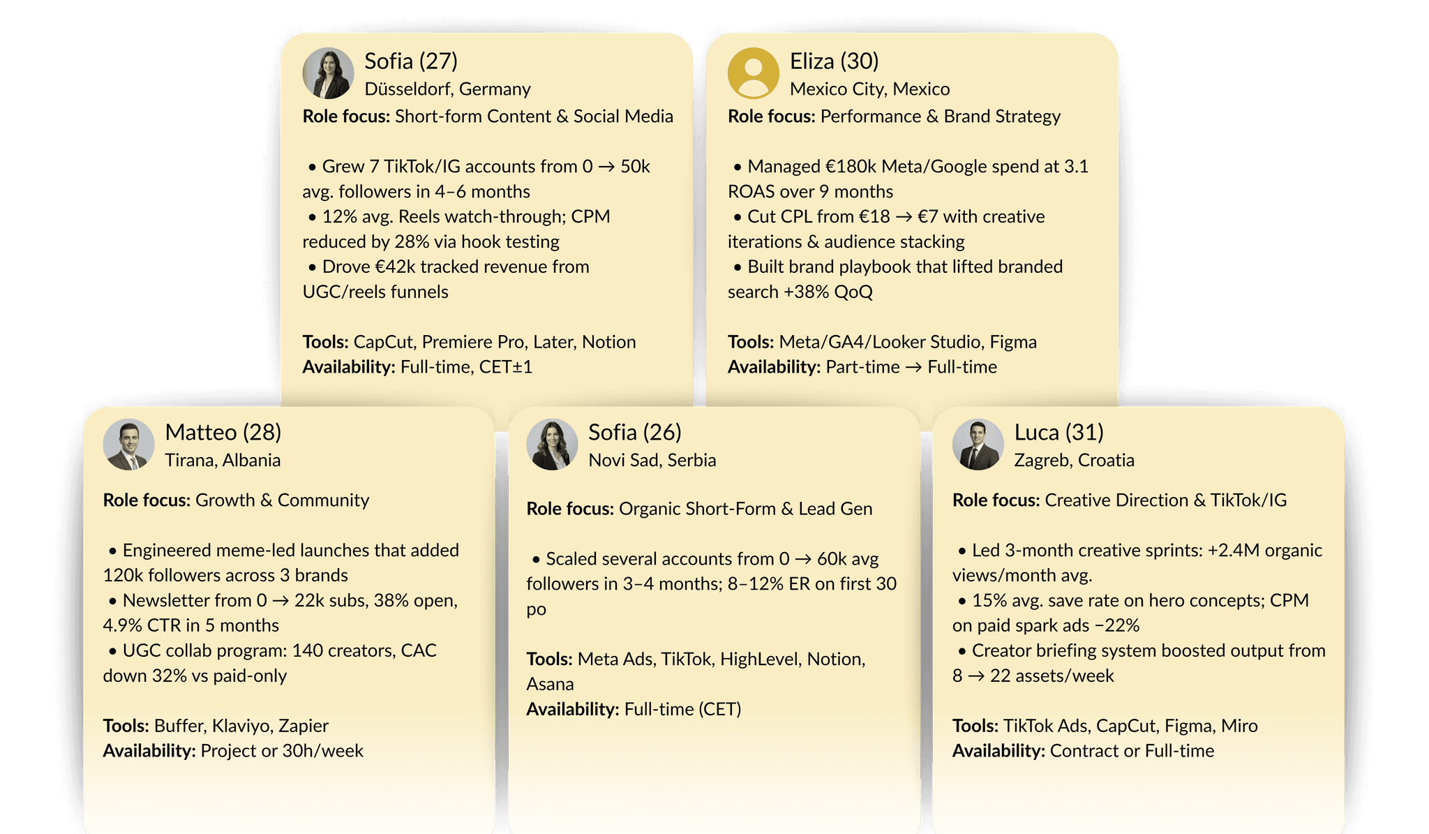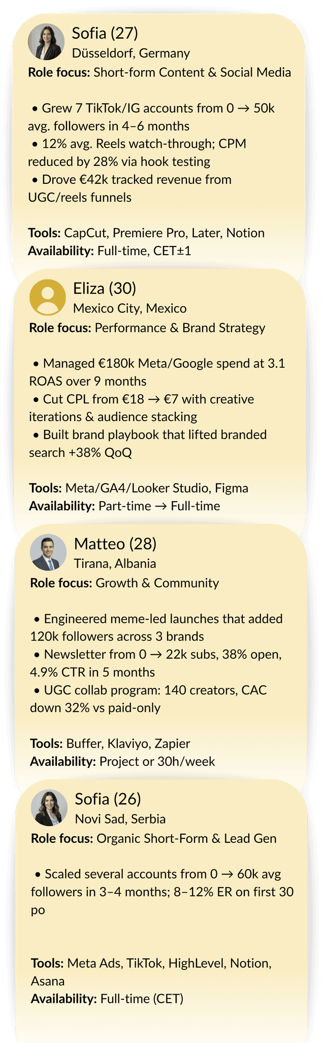 We exclusively recruit digital marketing professionals who understand the full funnel—people who blend data and creativity, optimize across channels, and build brands that grow consistently.