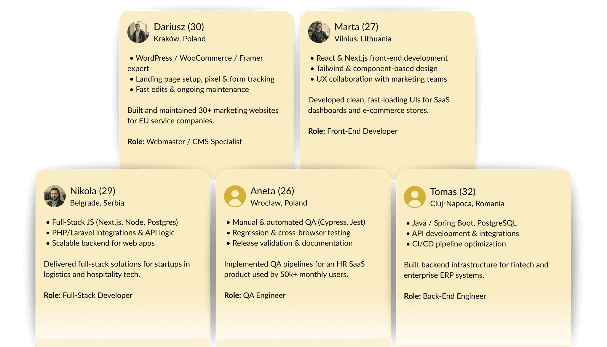 We place pre-vetted IT professionals across the web stack—CET-friendly time zones, strong English, and cost-efficient setups. Core squads are mid-level engineers with on-demand senior/lead support, so you move fast without enterprise overhead.
